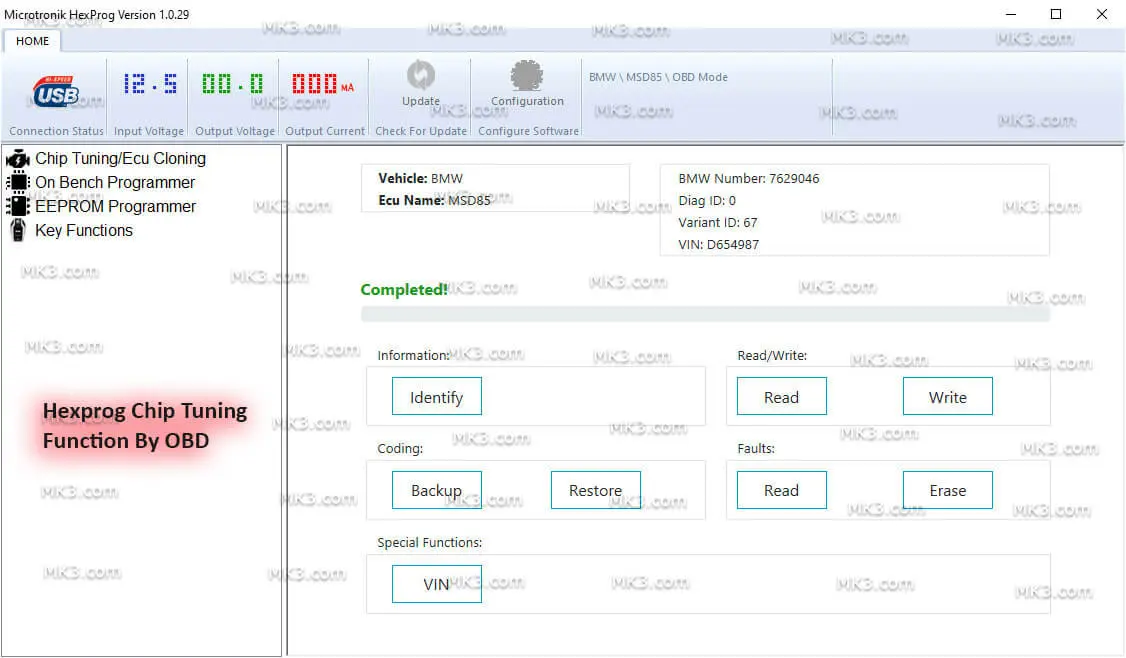 Since early 2021, HexProg has supported OBD functions, including reading/writing the map area (with virtual read capability). It also includes essential features for some ECUs, such as VIN changing, coding backup/restore, and fault code reading/erasing.